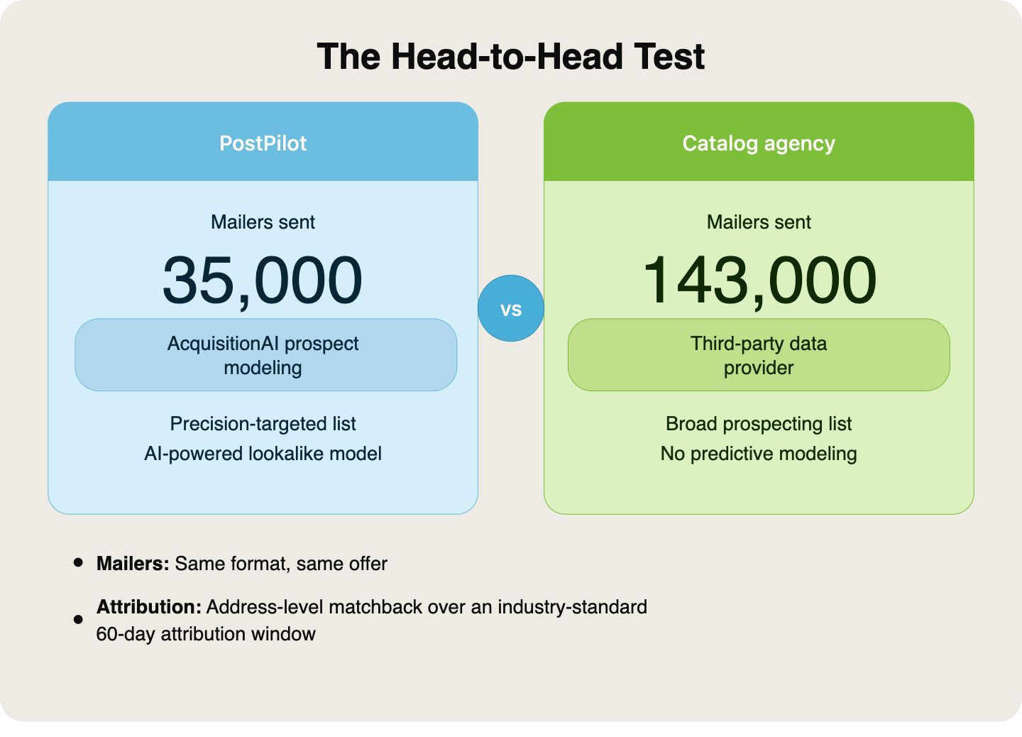 To evaluate PostPilot’s AcquisitionAI vs. the agency’s system, the brand ran a test using the same trifolds: